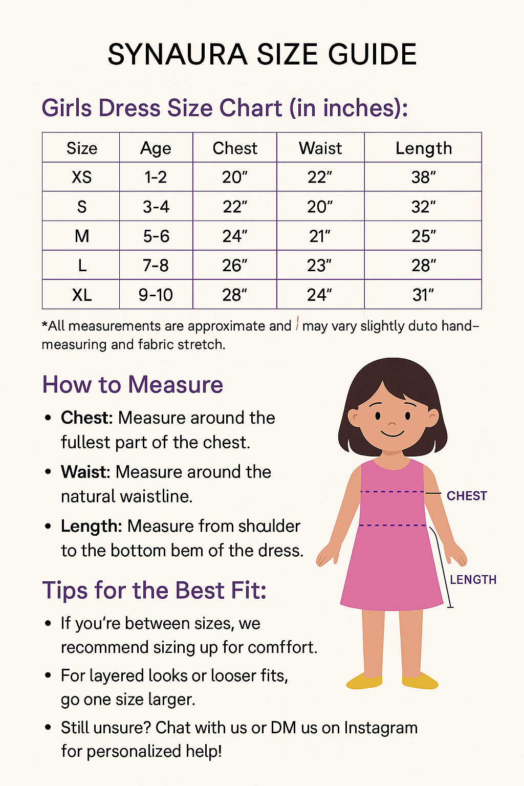 "Use our size guide to pick the right dress size for your little one. Follow our measuring tips for the best fit!"
